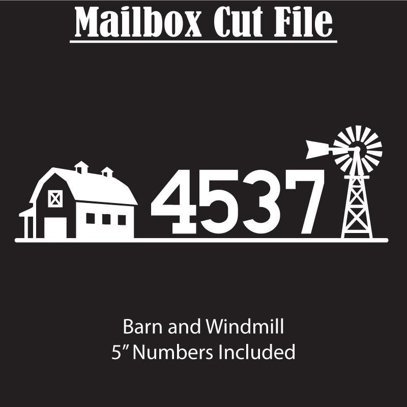 Mailbox street address digital cut files. Add some personality to your mailbox with this Barn and Windmill mailbox cut file, includes 5" street numbers, perfect for use with your digital cutting machines. Create your own vinyl transfers for your mailbox, or even use to create any type of signage that you would like to display street address on.