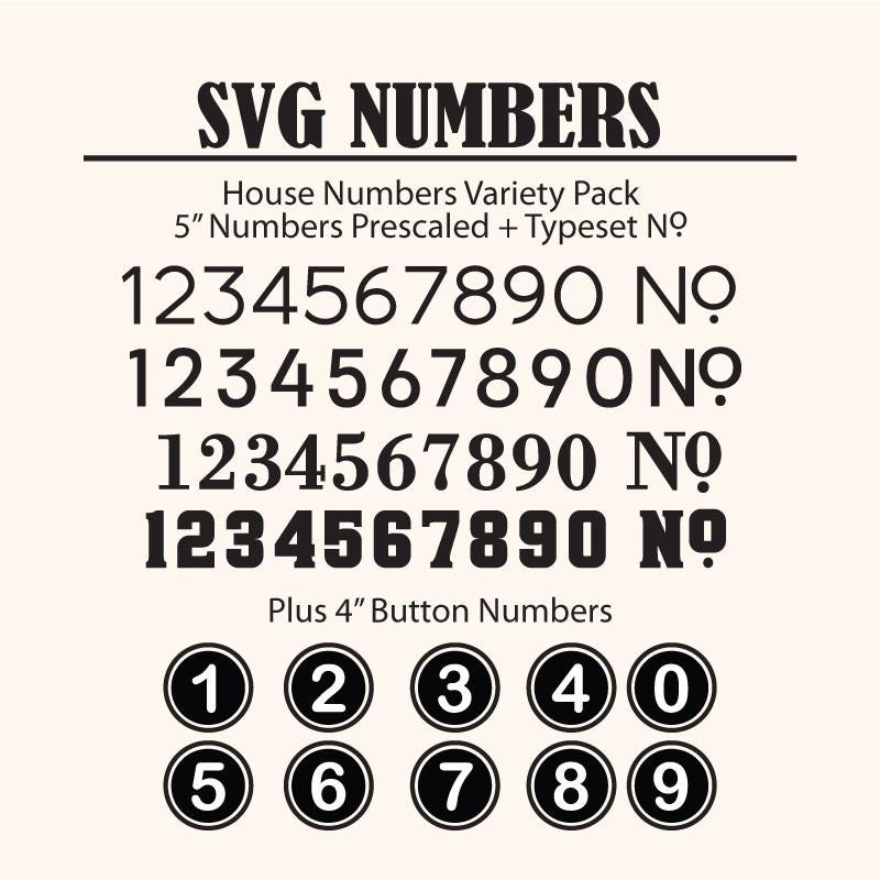 House Number 5 Pack is the name of the zip file that contains all 5 House Number Styles. A folder for each style is available when you unzip the folder. Inside each folder, the Numbers have been saved individually pre-scaled to 5" in height. The Button numbers are 4" in height.