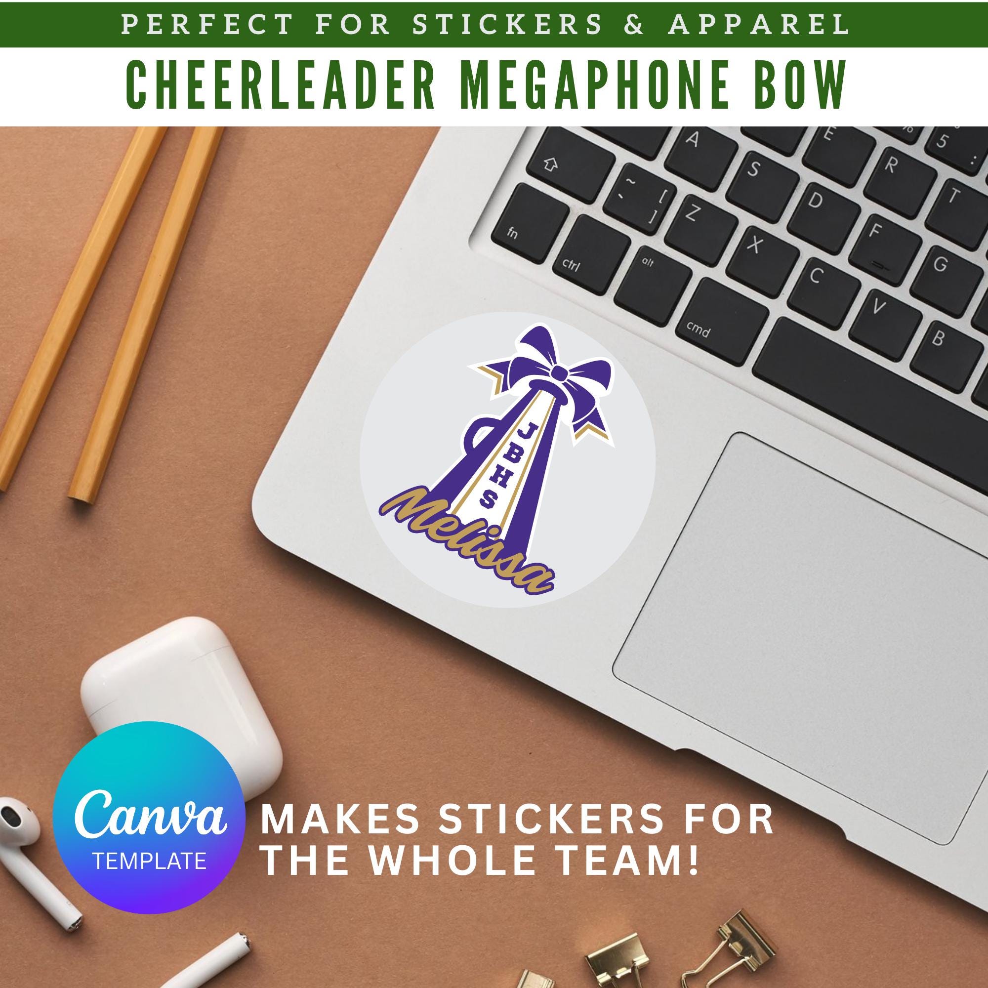 Customize this Canva template to make stickers or locker door sign for the whole team! Text is fully editable along with the colors on the Megaphone, School Letters, and Cheerleader Name.