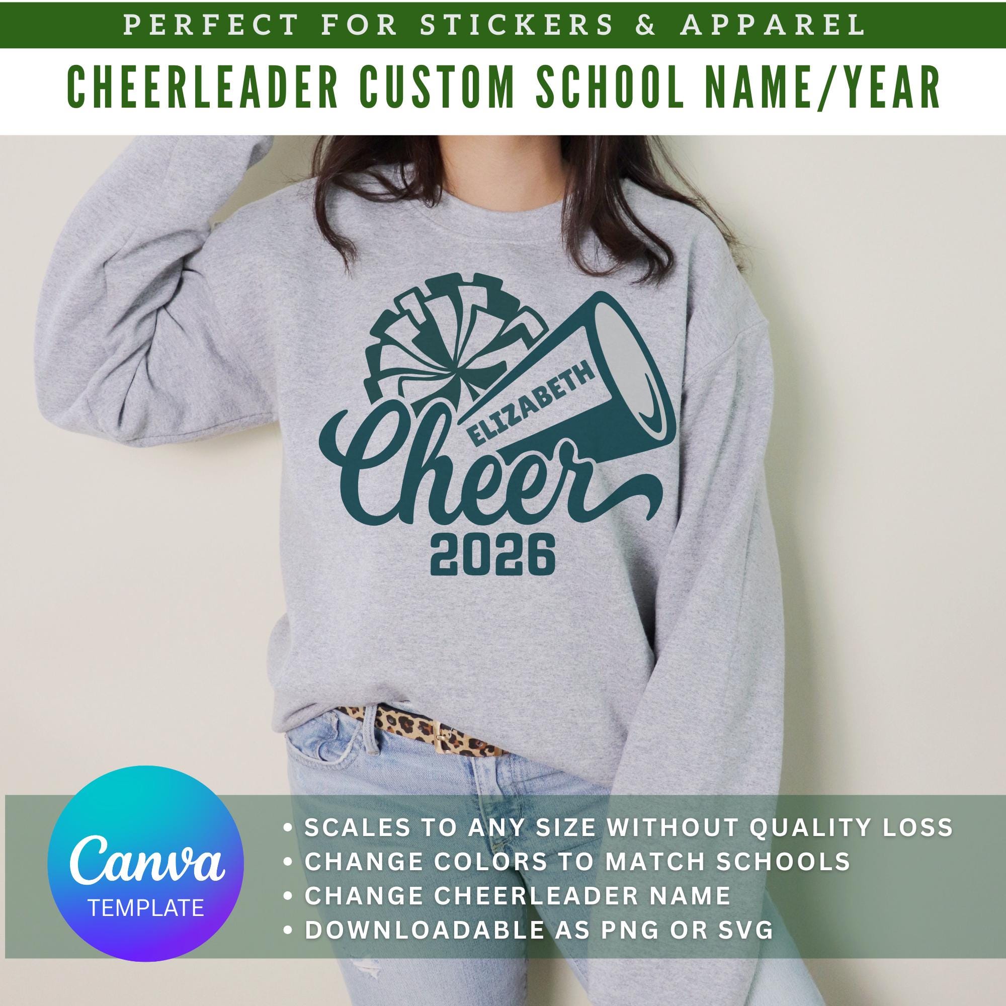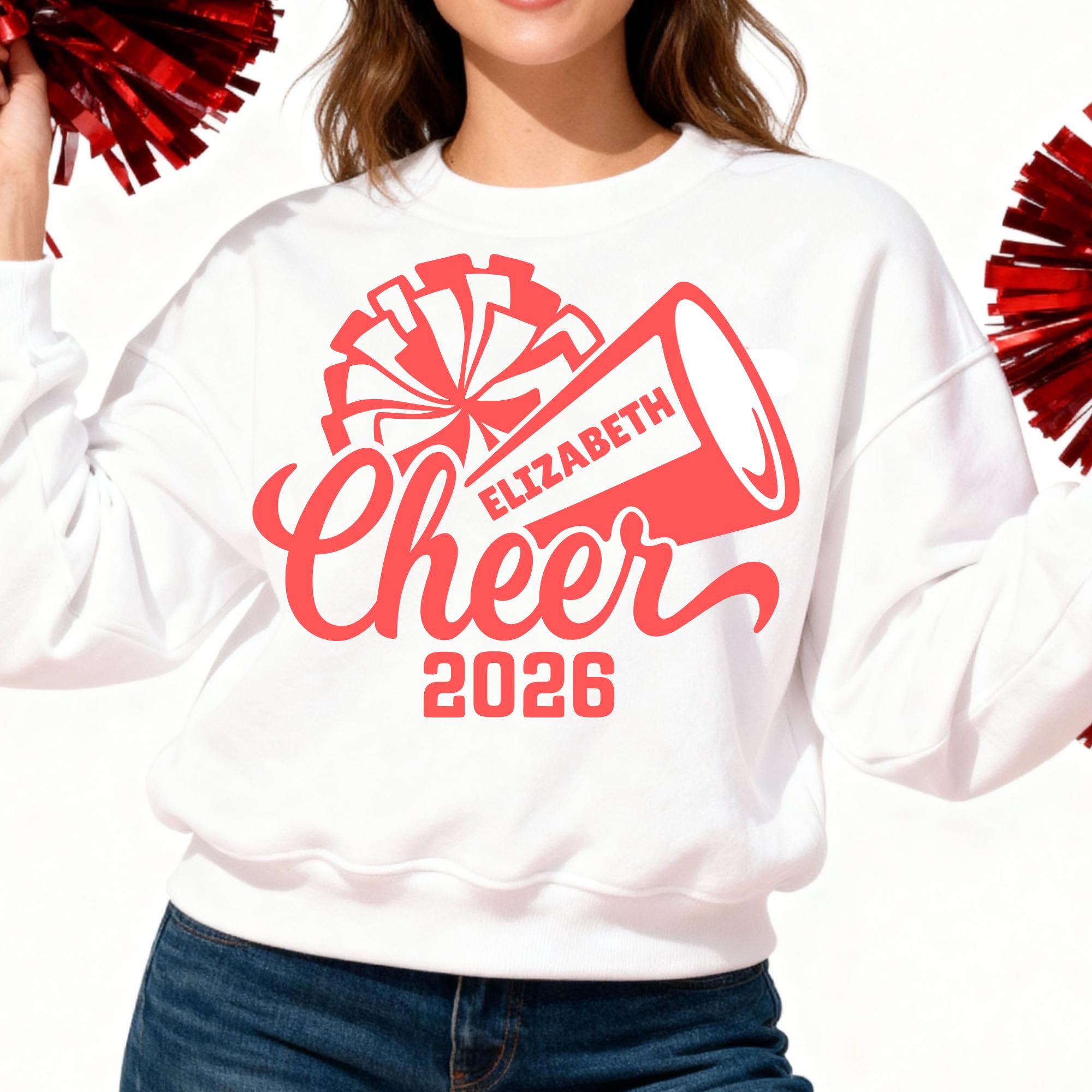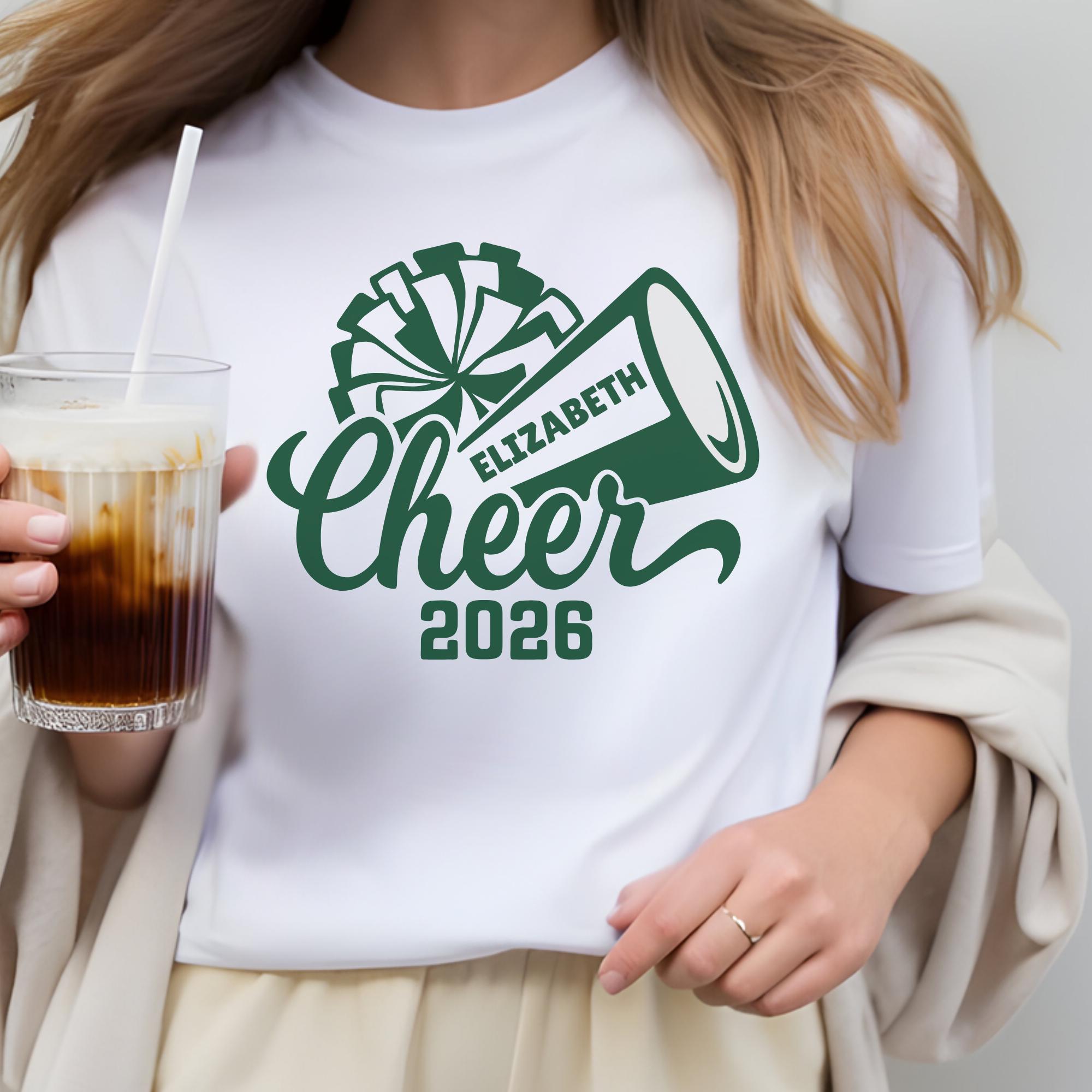 Customize this Canva template to make a Cheer Camp tee, sweatshirt, tote, even gift tags for the whole team! Cheerleader Name Text is fully editable along with the colors on the Pom Pom, Megaphone, Cheer letters and Cheerleader Name.